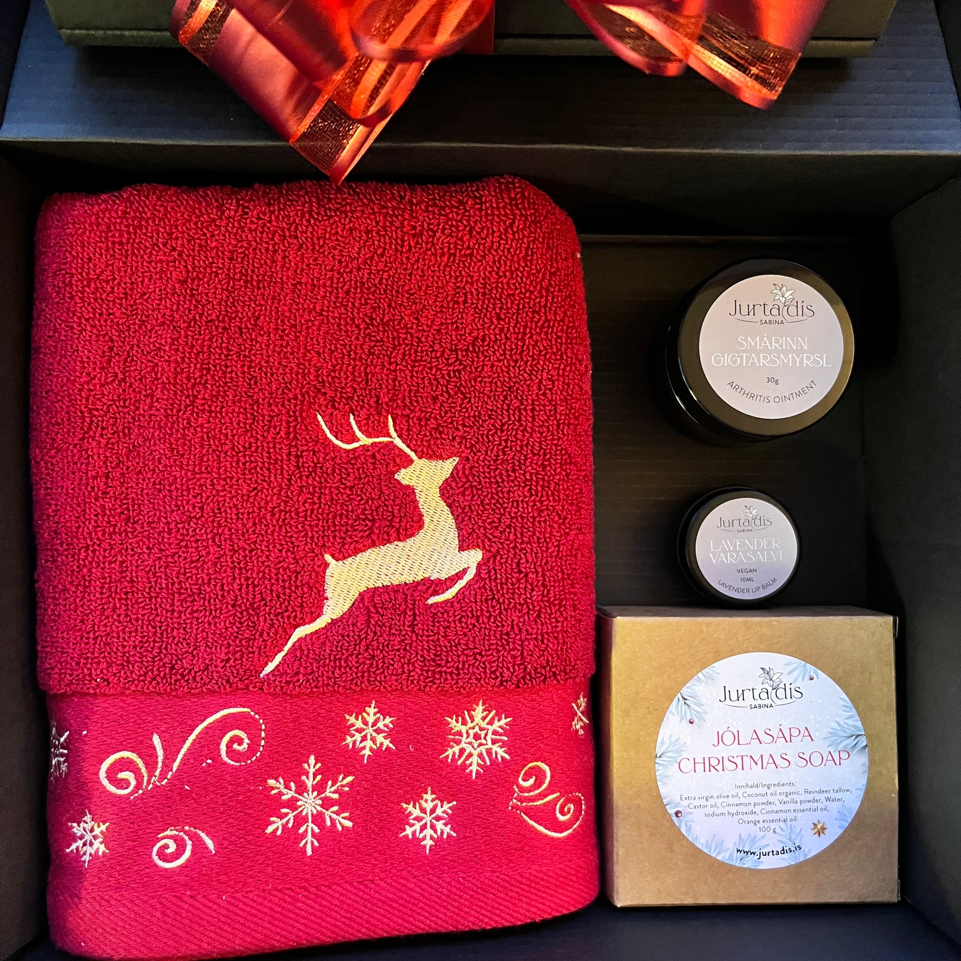 Jólasápa Hreyndýr -jólalegt útsaumuð -bomull handklæði Lavander varasalvi Smárinn - Gigtarsmyrsl 30g