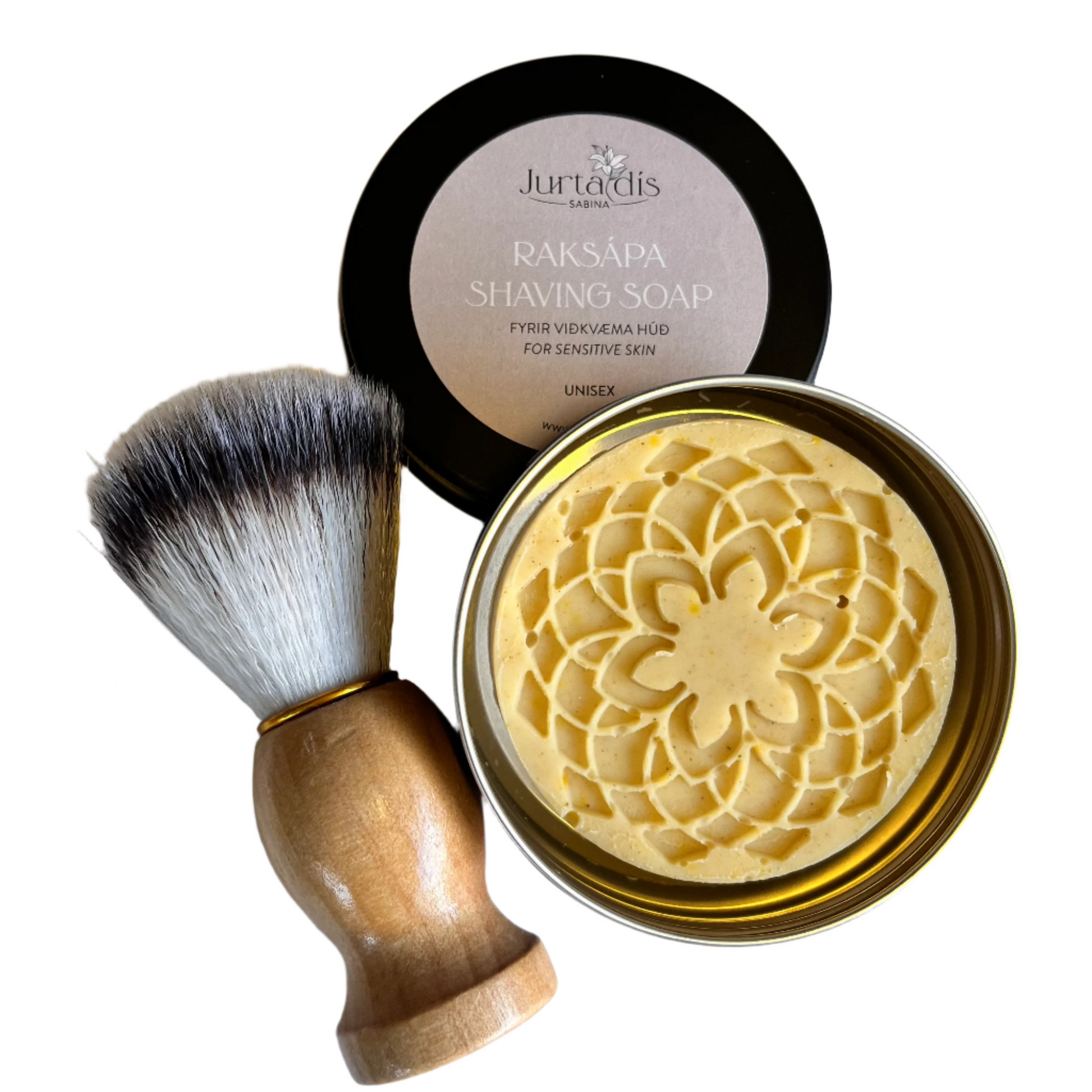 Dekraðu við þig með lúxus húðvörum úr náttúrulegum innihaldsefnum. Raksápa fyrir viðkvæma húð er unnin úr hágæða, róandi innihaldsefnum eins og kamilluolíu, morgunfrúarolíu, lífrænni kókosolíu og innihaldsríkri lárperuolíu. Með shea-smjöri, kakósmjöri og lífrænu hráu hunangi, veitir þessi milda og nærandi formúla fullkomna rakstursupplifun og róar viðkvæma húð. Raksturssettið samanstendur af sápu og rakstursbursta og er seld í fallegu álboxi með loki sem er fullkomið fyrir daglega notkun eða til ferðalaga. Allt er svo glæsilega pakkað í pappírsumbúðir – frábær gjöf eða til að gera raksturinn að lúxusupplifun.