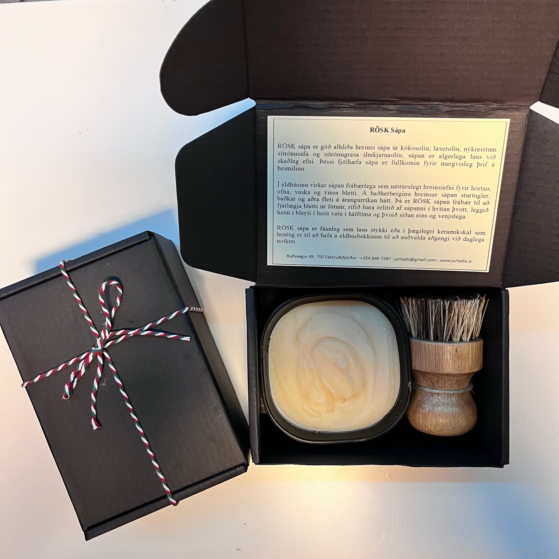 RÖSK sápa er góð alhliða hreinsi sápa úr kókosolíu, laxerolíu, nýkreistum sítrónusafa og sítrónugrasa ilmkjarnaolíu, sápan er algerlega laus við skaðleg efni. Þessi fjölhæfa sápa er fullkomin fyrir margvísleg þrif á heimilinu.